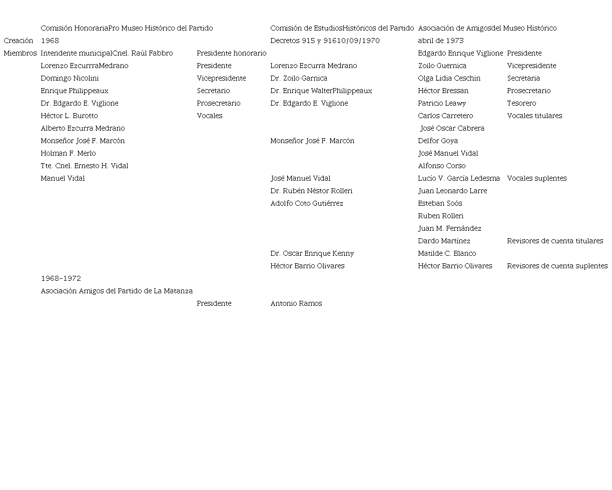 El valor de antigüedad primó en su intención de rescate de la propiedad y se planteaba en colaboración con el estado municipal: “es propósito de la Comisión coadyuvar con las autoridades, que se encuentran empeñadas en el mismo anhelo, para constituir la instalación del Museo Histórico y la posterior importancia de las colecciones que guarde dicho repositorio.” (Museo Histórico, 1968, s.p.). Tal es así que el presidente honorario de la agrupación era el Intendente de facto coronel (RE) Raúl Fabbro, y Lorenzo Ezcurra fue designado presidente. Entre sus miembros se encontraban Edgardo E. Viglione cuyo protagonismo ya se ha mencionado, el cura párroco local Monseñor Marcón; Domingo Nicolini, vecino vinculado a instituciones de San Justo; y el director de la escuela N°1 de San Justo, José Manuel Vidal. Junto a los notables locales, hay que mencionar la inclusión como vocal de Alberto Ezcurra Medrano, uno de los fundadores del Instituto de Investigaciones Históricas Juan Manuel de Rosas, y miembro del Instituto Argentino de Ciencias Genealógicas; del que también formaba parte Enrique Walter Philippeaux, quien fue designado secretario (véase tabla 1).