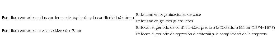 A su vez, estos grupos pueden subdividirse según los temas principales que abordan. De esta manera, las investigaciones sobre la militancia fabril en los años 70 pueden discernirse en dos líneas: organizaciones de base y grupos guerrilleros. Mientras que los estudios de caso sobre Mercedes Benz pueden separarse entre aquellos que enfatizan en la represión durante la dictadura militar y aquellos que evalúan el conflicto obrero entre 1974 y 1975, en el contexto del tercer peronismo. Es preciso esclarecer que las diversas investigaciones que se mencionan a continuación integran y entrelazan estas diferentes líneas. Sin embargo, creemos propicia esta división a partir de un agrupamiento según sus ejes centrales, como podemos visualizarlo en la tabla 1.