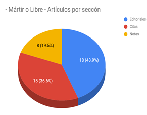 Sumado al dato netamente numérico, ambos periódicos cuentan con una sección de artículos destinada específicamente a que el editor vierta sus conceptos filosófico-políticos que encabeza los números en los que aparece: las “Observaciones Didácticas” en Mártir o Libre y el “Cuadro Político de la Revolución” en el caso chileno. Los artículos propios de carácter editorial, sin embargo, no se reducen a los que abarcan en dichas secciones, sino que se suman a ellos editoriales sobre otras temáticas como la expedición al Perú.