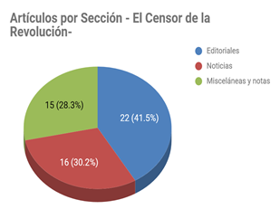 En lo que respecta a la materialidad y construcción del periódico, Mártir o Libre y El Censor de la Revolución no son tan disímiles como lo son en los conceptos que vierten. En primer lugar, ambas son publicaciones que podríamos denominar “de autor”, es decir, publicaciones que tienen como objetivo central ser el vehículo para la prédica política de su editor. Esta definición está nítidamente reflejada en el tipo de artículos que caracterizan a ambos periódicos, los artículos propios o “editoriales” son mayoritarios (Figuras 1a y 1b).