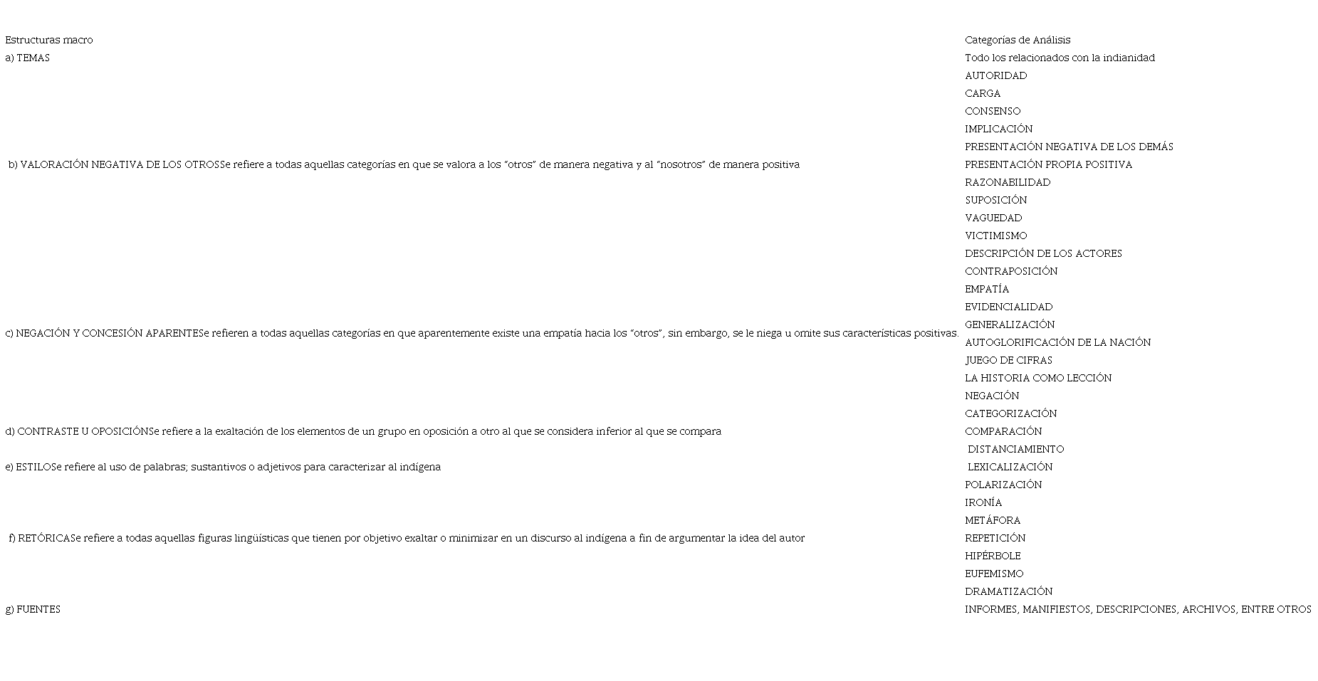 La tabla 1 da cuenta de las categorías que se emplean en el caso del Manifiesto Beleña.