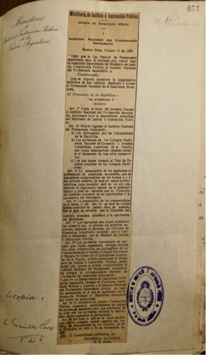 Luego encontramos documentación en la oficina de Rectorado. Esta se compone de series documentales administrativas y normativas, generadas por los órganos de gobierno del Instituto. Esta documentación se encuentra encuadernada y protegida en compilaciones e incluye: actas del Consejo Directivo; decretos y resoluciones ministeriales (Figura 3); resoluciones internas; nóminas de personal, sueldos y designaciones; correspondencia oficial; compilaciones impresas (Boletines y Decretos encuadernados). Estos documentos se encuentran encuadernados y protegidos en compilaciones,[5] aunque bajo condiciones de guarda no siempre adecuadas. La ausencia de inventarios detallados y la falta de procedimientos sistemáticos de conservación preventiva limitan su consulta y su potencial uso como fuentes para investigaciones históricas y pedagógicas.