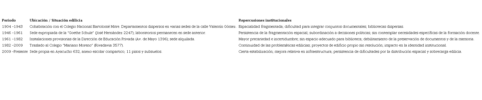 El recorrido por diferentes sedes evidencia patrones de precariedad que trascienden las particularidades institucionales para inscribirse en políticas más amplias de falta de financiamiento de la educación superior de formación docente. Esta itinerancia, prolongada y reiterada a lo largo de más de un siglo, no implicó únicamente traslados físicos, sino que afectó profundamente la organización académica y administrativa del Instituto. Mientras se consolidaba como referente nacional en la formación del profesorado secundario, el Joaquín debió compartir espacios, ocupar edificios provisorios o alquilados y depender de asignaciones estatales sin planificación específica. Esta inestabilidad impactó directamente en gabinetes, bibliotecas, archivos y colecciones científicas, todos ellos pilares del proyecto formativo que lo caracterizó. A diferencia de otras instituciones normalistas, que lograron consolidar archivos históricos, el Instituto no desarrolló una política patrimonial sostenida, en parte por la falta de condiciones materiales que garantizaran continuidad, sistematización y resguardo. En la tabla 1 se presenta una síntesis del recorrido edilicio y sus implicancias institucionales: