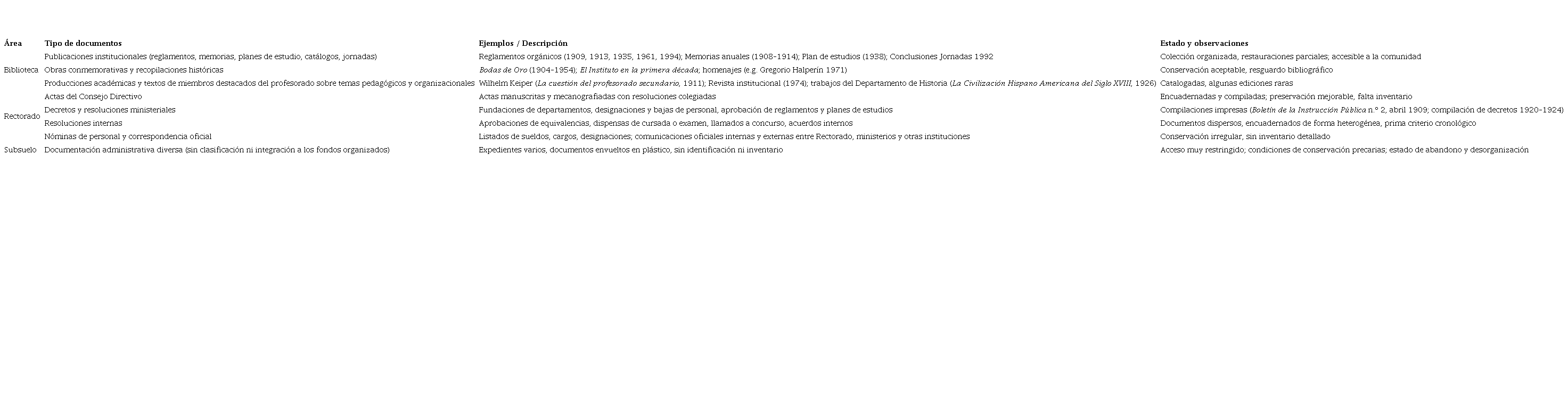 La documentación considerada de interés histórico se localiza principalmente en tres áreas: la oficina de Rectorado, la Biblioteca y un sector en el subsuelo,[4] cada uno con características particulares de acceso, organización y estado de conservación. A modo de síntesis, la Tabla 2 presenta un inventario exploratorio y preliminar de los fondos documentales identificados hasta el momento en Biblioteca, Rectorado y subsuelo. Sin embargo, es necesario advertir que esta descripción se basa en información fragmentaria, relevada mediante observación directa e indirecta, y deberá ser complementada y validada en etapas posteriores del proyecto archivístico.