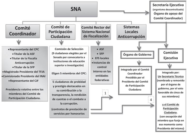 Con esta presión “ciudadana” y de los medios de comunicación, es que se define un Sistema Nacional Anticorrupción (SNA), que consta de la expedición y reforma de nueve leyes. Para garantizar el combate de la corrupción en la conformación de un SNA, con base en su propia ley, se conformará un Comité Coordinador; el Consejo de Participación Ciudadana, el Comité Rector del Sistema Nacional de Fiscalización, los Sistemas Locales Anticorrupción y una Secretaría Ejecutiva del SNA, cambiando significativamente el modelo inicial de una Comisión Nacional Anticorrupción como organismo constitucional autónomo.