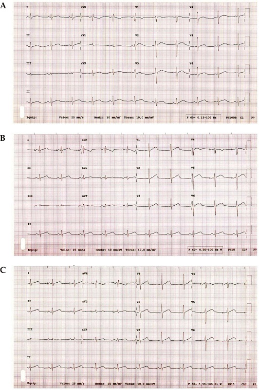 A) At the basal period, presenting QTc = 495ms; B) At the end of anesthesia, with epinephrine, presenting QTc = 480ms; C) At the end of procedure, with epinephrine, presenting QTc = 440ms.