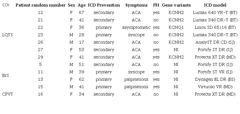 Results: Twenty-four consecutive procedures were performed in 12 patients (9 women, 3 men) with CCh and ICD: 7 (58.3%) had long QT syndrome (LQTS), 4 (33.3%) Brugada syndrome (BrS), and 1 (8.3%) Catecholaminergic polymorphic ventricular tachycardia (CPVT). Holter analysis showed no increased heart rate (HR) or sustained arrhythmias. Blood pressure (BP), electrocardiographic changes and anxiety measurement showed no statistically significant differences. No LTE occurred during dental treatment, regardless of the type of anesthesia.