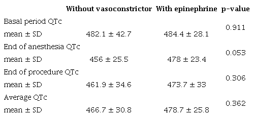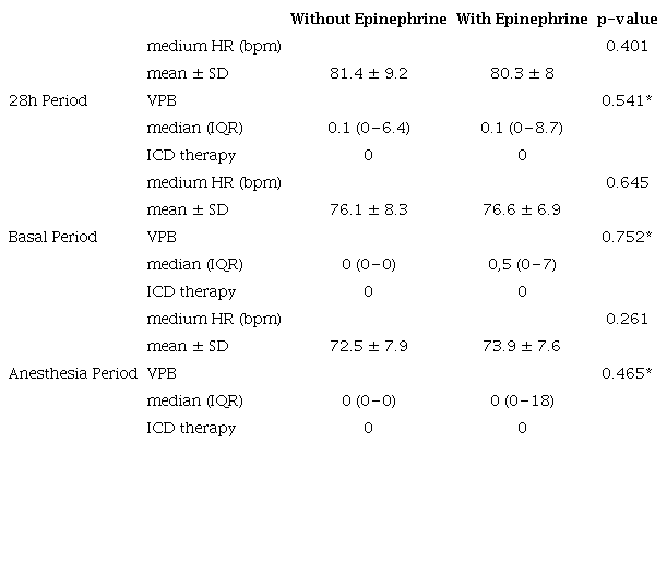 Holter monitoring registered the HR and numbers of supraventricular and ventricular premature beats per hour in both conditions (with and without epinephrine) during the study periods, with no significant difference between them (P>0.05) ( Table 2).