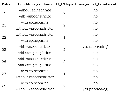 In a previous study, the use of local dental anesthesia with and without epinephrine in selected stable patients with LQTS and BrS did not result in life-threatening arrhythmias, though the maximum HR increased after the use of vasoconstrictors during the anesthesia period. 23
