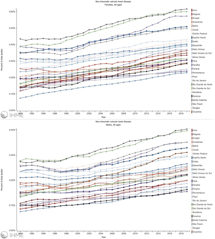 According to the GBD 2019, the prevalence of calcified aortic valve disease in Brazil has tended to increase to a total of 201.8%, from 7.9 (95% IU 6.3 - 9.6) per 100,000 in 1990 to 23 .7 (95% IU 19.1 - 29) per 100,000 in 2019, with an increase of 218.8% for men and 182.2% for women.