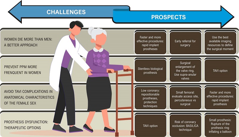 Synopsizing the above, figures 2 and 3 are central figures, they represent a general summary of the important aspects contained in different parts of this text. Figure 2 presents the characteristics of degenerative aortic stenosis in women, enumerating anatomical, clinical, pathophysiological and therapeutic aspects present in females. Figure 3 seeks a correlation between the differences found and the prospects for a solution for each challenge that is presented.