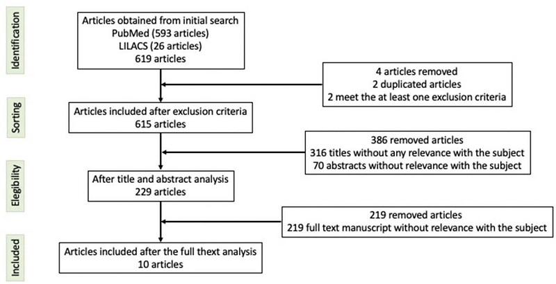 Thus, in the initial stage, 615 titles were analyzed by independent reviewers. For articles in which there was disagreement, a third evaluator was requested to reevaluate. Of the titles analyzed, 299 studies were included in the abstract evaluation. Of these, 229 were considered relevant, with 10 of them being systematic reviews used in this work ( Figure 1 ).
