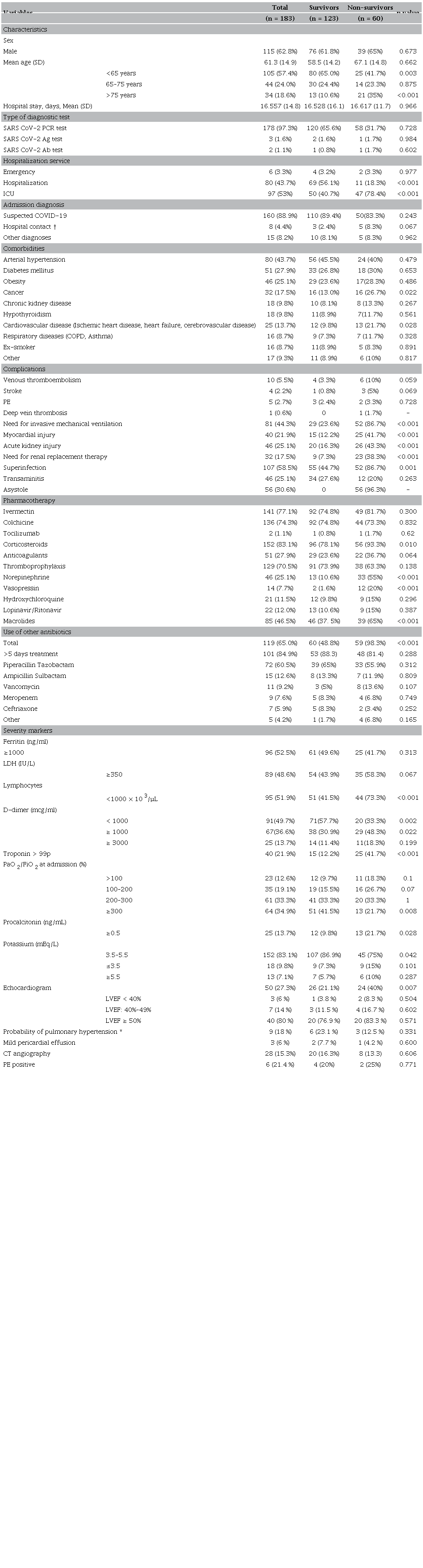 Complications occurred more frequently among non-survivors than among survivors, with a greater need for mechanical ventilation, along with higher incidence of acute kidney injury and myocardial injury. Diagnosis of superinfection was also more frequent in this group of patients and was associated with administration of antibiotic regimens lasting more than 5 days.