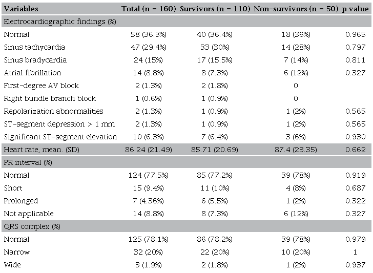Results: This study included 183 individuals; of whom 160 were considered for electrocardiographic analysis, 63% of which evidenced significant findings, the most frequent being sinus tachycardia (29.4%). The frequency of myocardial injury was 21.9% and was more common among non-survivors than among survivors (41.7% vs. 12.2%, p < 0.001). Myocardial injury was also significantly more common in patients who presented electrocardiographic findings than those who did not (26.5% vs. 12.1%, p = 0.032) and in those who required intensive care admission (31.8% vs 10.5%, p < 0.001). The strongest mortality-associated factor was the need for mechanical ventilation — odds ratio (OR), 9.14; 95% confidence interval, 3.4–24.5.