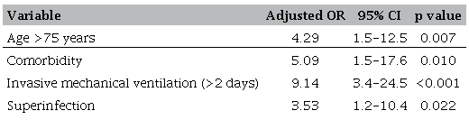 To develop the final logistic model (183 subjects), a saturated model was started, adding variables with statistical significance in the crude associations or bivariate analysis, such as: age, hospitalization service, presence of comorbidity, history of cardiovascular disease and cancer, need for invasive mechanical ventilation and days of ventilation, myocardial injury, acute kidney injury, need for renal replacement therapy, superinfection, need for corticosteroids, vasopressin, norepinephrine, macrolides, use of other antibiotics, and severity markers.