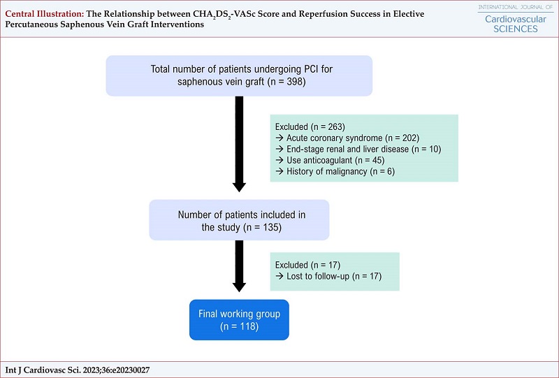 In this study, patients who underwent coronary angiography due to the presence of angina resistant to medical treatment or the detection of ischemia in stress test or non-invasive functional imaging tests between January 2012 and January 2018 were retrospectively analyzed at our cardiology clinic. Among 18,823 patients with accessible archive data, patients with previous CABG who underwent SVG PCI were selected. Patients who underwent PCI for SVG were excluded from the study if they had ACS within the last 6 months, were admitted to our hospital with ACS diagnosis, had a history of malignancy, had end-stage renal and liver disease, were under anticoagulant treatment for AF or any other reason, or if their 1-year follow-up data could not be accessed from the hospital registry system. Finally, the remaining 118 patients were included in the study ( Central Illustration). The institutional review board approved the study protocol, and permission to present the data was granted by ethics committee. The study was conducted in accordance with the principles of the Declaration of Helsinki.