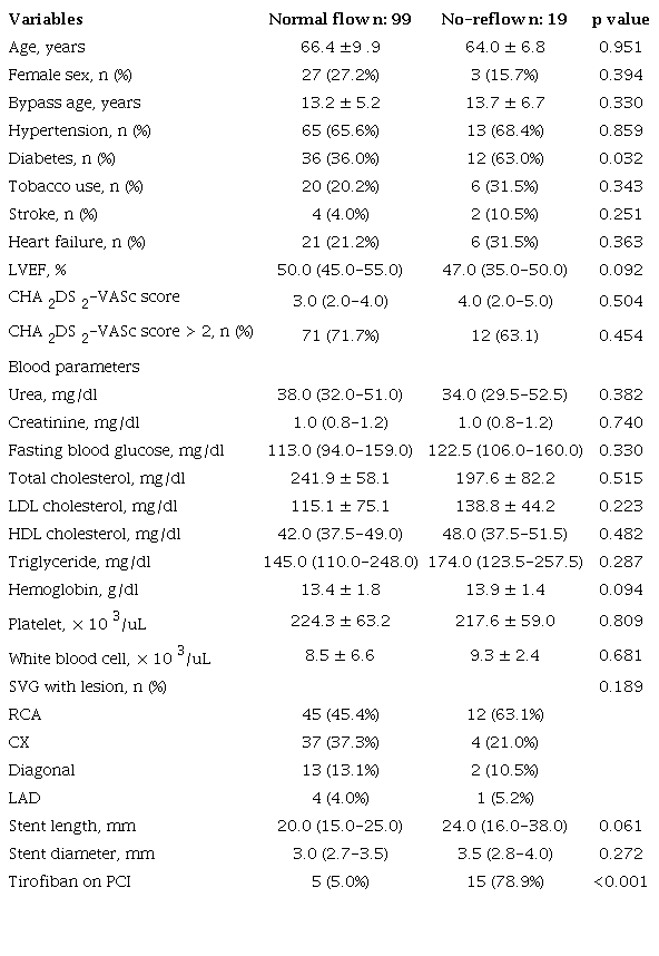 The patients were divided into 2 groups: no-reflow and normal flow. No-reflow was developed in 19 (16.1%) of the patients. There was no significant difference in demographic characteristics such as age and sex between normal flow and no-reflow groups, while the number of patients with diabetes mellitus in the no-reflow was significantly higher ([36% versus 63%], p = 0.032). Both groups were similar in terms of the mean SVG ages. There was no significant difference between the groups in terms of CHA 2DS 2-VASc scores. The median CHA 2DS 2-VASc was 4 in the no-reflow group and 3 in the normal flow group, and this difference was not statistically significant (p = 0.504). No significant difference was found in the LVEF values between the two groups ( Table 1).