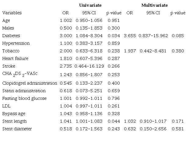 According to the regression analysis, although diabetes mellitus and stent length seemed to be associated with no-reflow, they were not statistically significant in the multivariate analysis ( Table 3). The logistic regression analysis, which was performed to identify the predictors of total adverse cardiac events, TVR, and 1-year mortality, revealed that none of the variables were statistically significant.