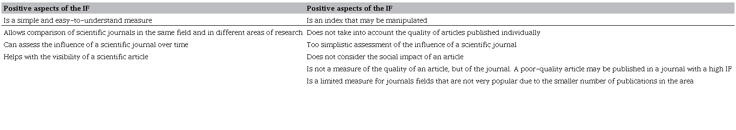 The IF can positively or negatively impact the prestige of a journal. Also, the IF may be used by institutions and funding agencies to assess the quality of research produced by the authors … However, it is pertinent to note that despite its wide dissemination and acceptance, the IF should not be evaluated alone as it may not fully reflect the quality of research.5–8 In addition, the IF may privilege more popular areas of research, while ignoring innovative and emerging fields (Table 1).