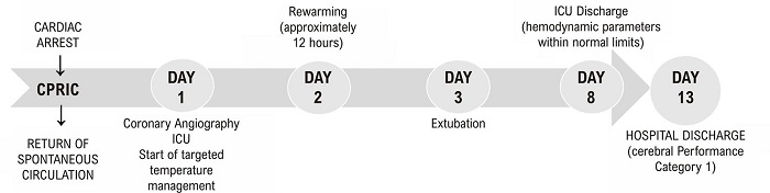 The patient was then transferred to the intensive care unit, where he underwent targeted temperature management by infusion of 20ml/Kg of cold saline solution at a target temperature of 33 °C and a thermal mattress for 24 hours. He then underwent active rewarming, reaching normal temperature in approximately 12 hours.