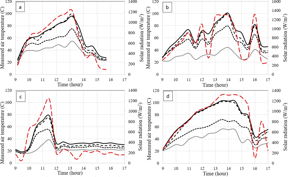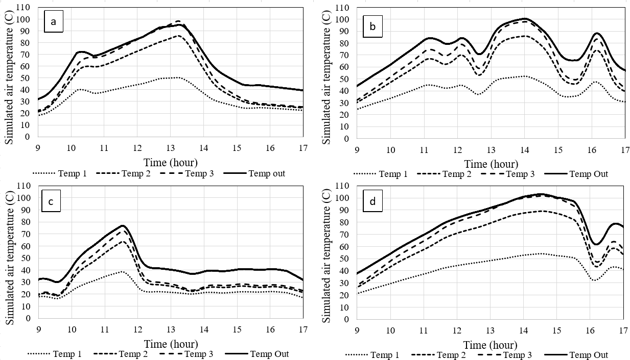 The temperatures of the circulating upper air were measured. As commented in the previous section, K-type sensors were used and the measuring procedure was carried out during the operative period of the SAHC, from 9 a.m. to 5 p.m. Although the ASHRAE code sets the conditions for testing the equipment [47], both clear-sky and cloudy-sky conditions were considered to make simulations under real operative situations. Fig. 12 shows the measured air temperatures for the upper channel. It can be observed that the air temperature peaks between 80 °C and 100 °C. As expected, the shape of the curves follows the solar radiation profile. This indicates that the SAHC has low thermal inertia, and it can quickly reach the thermal state of operation when the solar radiation has suitable values. Since drying processes require a temperature range of 50–60 °C [48] for optimal performance, the SAHC needs solar radiation between 600 W/m2 and 900 W/m2. For cloudy-sky conditions, with solar radiation of about 200 W/m2, the outer air temperature is about 35–40 °C. This represents an advantage because a reduced size of an auxiliary heat source is available, if necessary.
