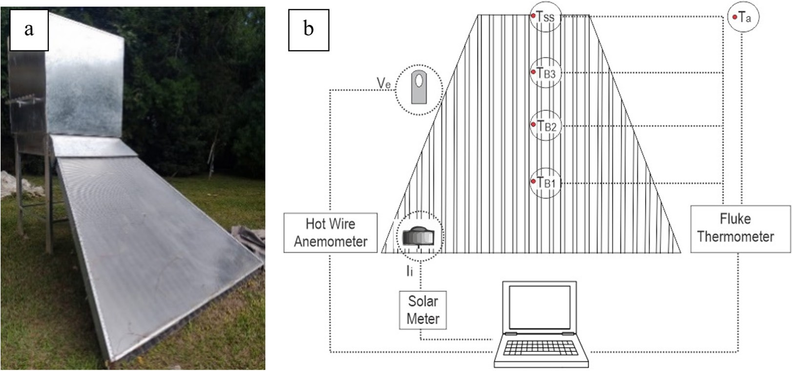 The trapezoidal SAHC location was -24.69 Latitude and -65.39 Longitude, and it was north-oriented with a fixed optimal slope of 36° for a homogeneous solar collection throughout the year. In order to replicate the real working conditions, the SAHC was connected to a drying chamber of 1 m3 volume, as shown in Fig. 11a.