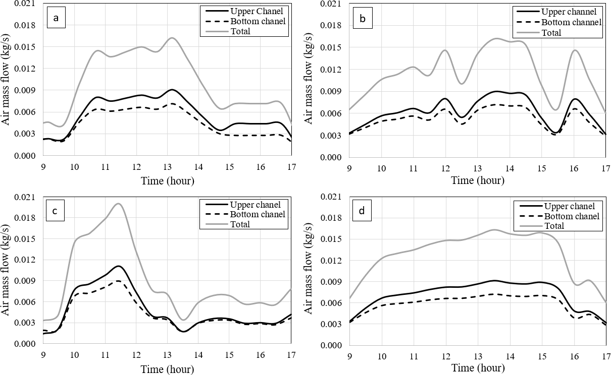 Eqs. 20, 21, and 22 give the air mass flow in kg/s for both upper and bottom channels and the total air mass flow, respectively. The heat gain and the air temperature are important in establishing the air mass flow (Fig. 8). It can be observed that the air mass flow is different for each channel because of the different heat gains. The highest air mass flow corresponds to the upper channel, which means that the air velocity is the highest there. This numerical result was expected because the heat source (the absorber) is located under the air thermal node in the upper channel, while the same heat source is located above the air thermal node in the bottom channel.