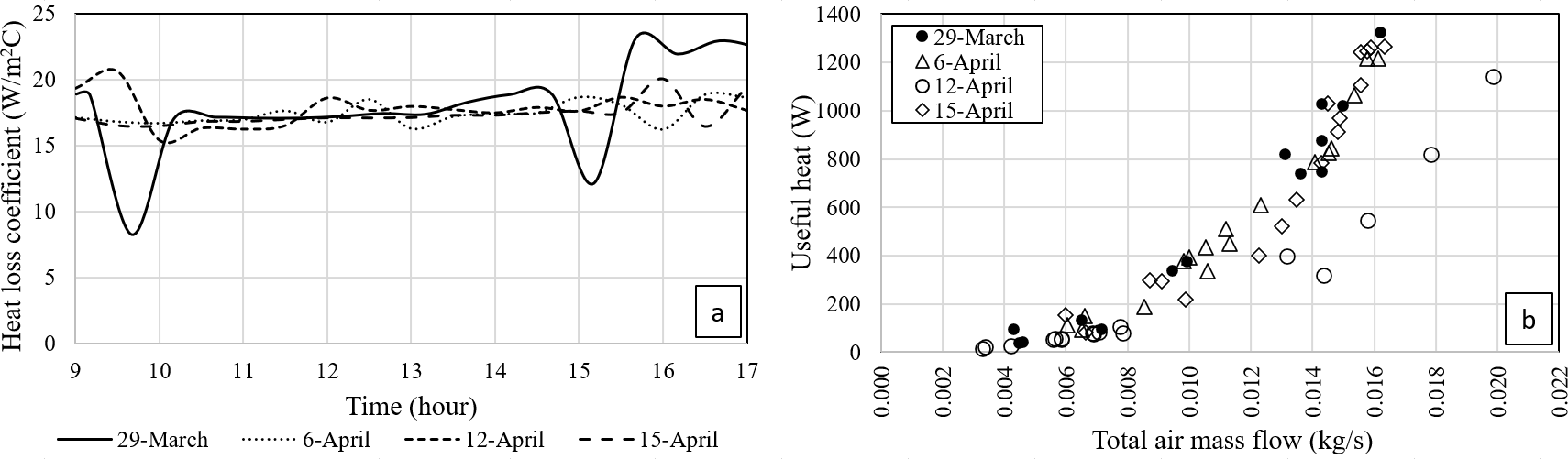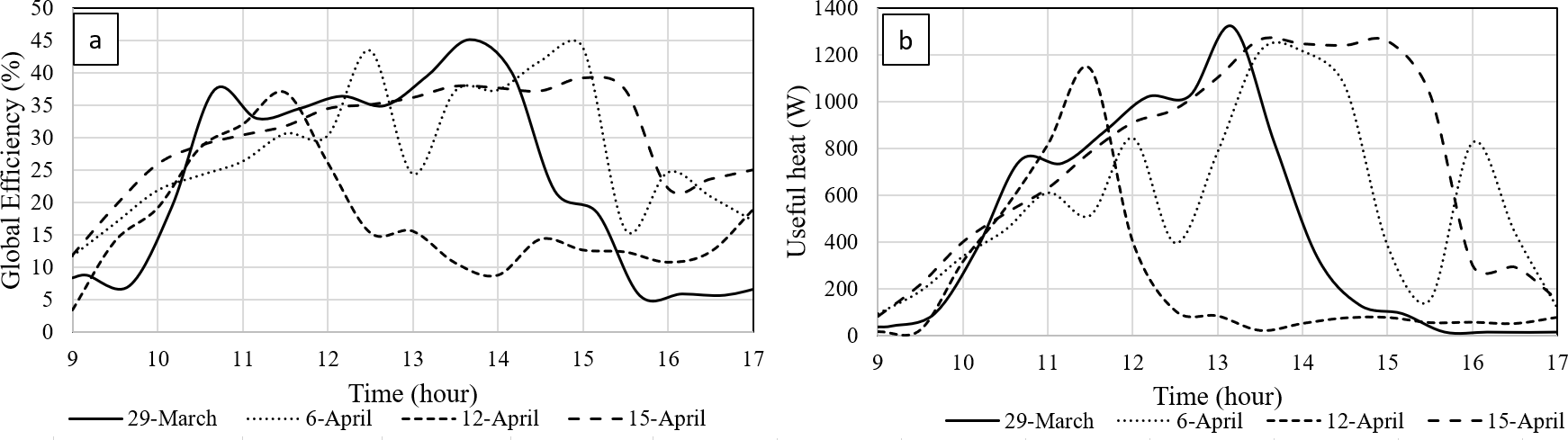 The useful heat gain is determined by Eq. 18, which takes into account the air mass flows of both channels and the difference in output-input air temperatures. Here, the dependence on the temperature of the specific heat of the air was neglected. Fig. 9 shows the useful heat profiles for the four days considered. A maximum thermal power output of about 1200 W can be reached by the SAHC under study. The global efficiency is determined by Eq. 19, and Fig. 9 shows this parameter, where, in clear-sky conditions of operation, an average value of 35% is observed, in the hours around the midday, while efficiency varies on cloudy-sky days. Peaks of about 45% on global efficiency are reached by this SAHC.