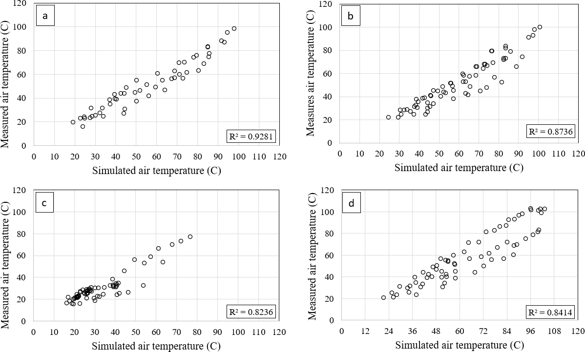The experimental and numerical results were compared (Fig. 13). Based on direct measurements, the air temperature for the upper channel was considered the main variable for performing the comparison. For the set of measured days, the determination coefficient R2 ranged from 0.82 to 0.93. The lowest correlation was obtained for a mostly cloudy day, where the predominant solar radiation was about 200 W/m2 after midday (April 12). This correlation can be considered acceptable despite the unstable working conditions. For a clear-sky condition, the correlation coefficient was 93%. Intermediate correlation values were observed for semi-cloudy sky conditions. The more stable climatic conditions, the better adjustment is achieved by the numerical model.
