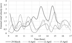 The scattering observed in Fig. 13 can also be explained by the surrounding wind variability when the measurements were performed (Fig. 14). As the SAHC studied here is a natural convective one, the oscillation of external wind produces variations in the external pressure near the inlet/outlet zones, influencing the air mass flow inside the SAHC, and therefore, the internal convective coefficients present high variability. Fig. 14 also shows a range of 0.1–3.4 m/s for wind velocity. This is a climatological feature of the region where the SAHC is mounted [49].