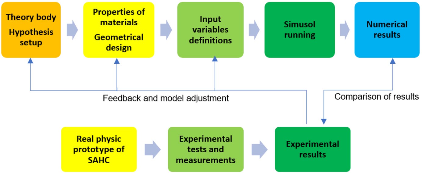 The modeling implemented in Simusol demonstrates once again that it is a reliable numerical tool for designing thermal technologies. Although the SAHC behaved as expected, more experiments are necessary to fine-tune the model. Additionally, a more accurate numerical description of the internal convective heat transfer mechanism could further improve the model. More accurate heat and mass transfer modeling will be done in the future, even with the drying chamber included in the model.