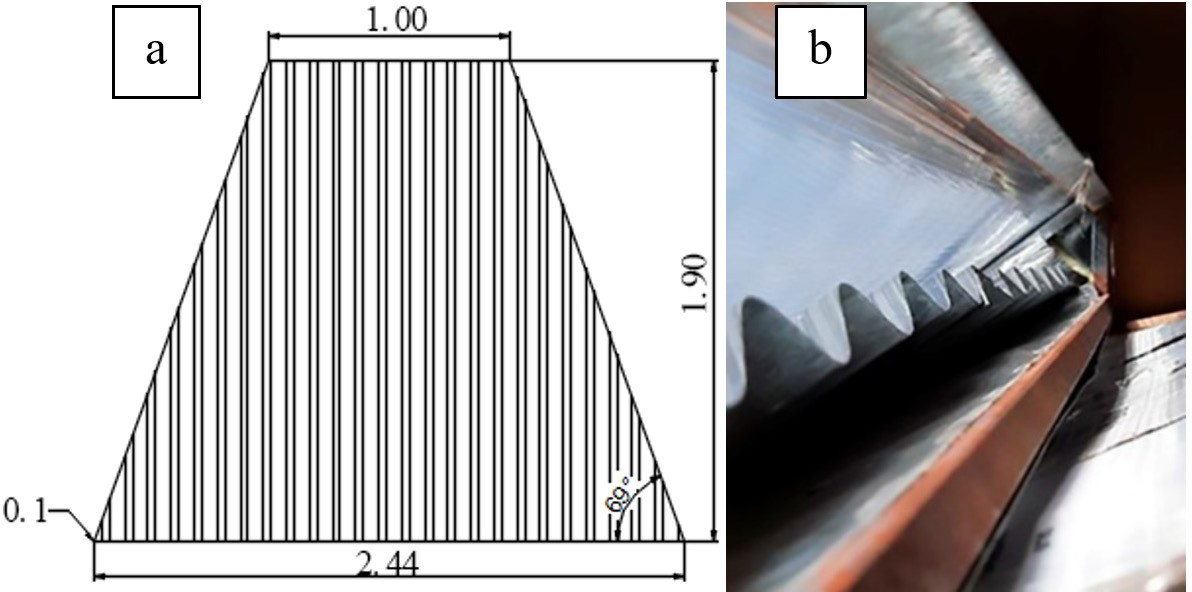 Fig. 2 shows the analyzed trapezoidal SAHC. The dimension of the collection area is 2.44 m x 1 m wide (bottom length and top sides, respectively) and 1.9 m length. See Fig. 2a. The total trapezoidal area of collection is 3.3 m2. The total inner height is 0.1 m, and the cross section decreases along the collector length. Therefore, the inlet area of the flow is 0.244 m2 and the outlet area is 0.1 m2. This configuration influences air circulation by increasing air velocity as the area decreases.