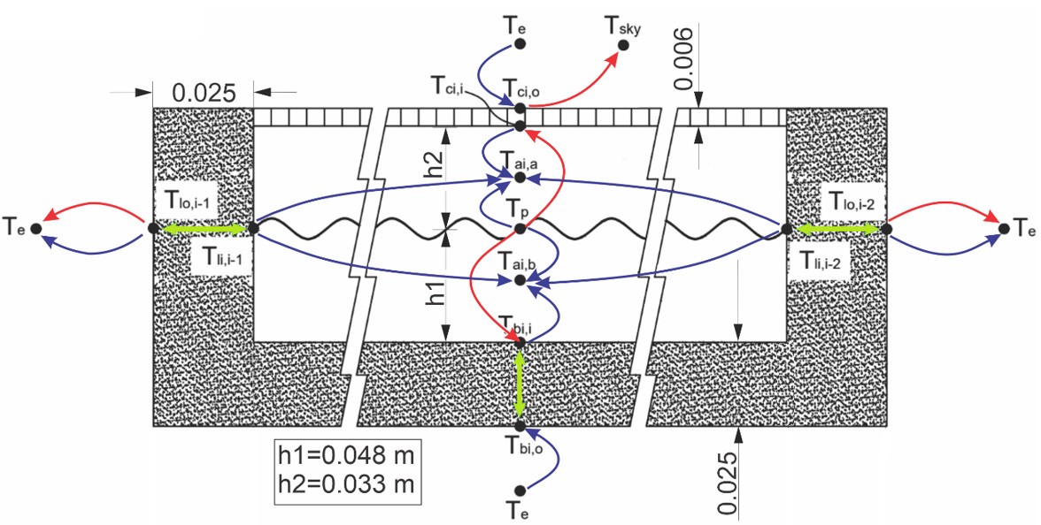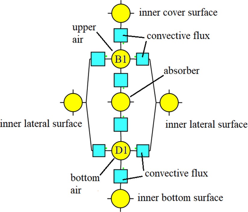 The convective fluxes and are calculated by Simusol and repr esent the thermal gain from the absorber, lateral walls, covering, and bottom surface into respective air flow nodes, as Fig. 5 shows.