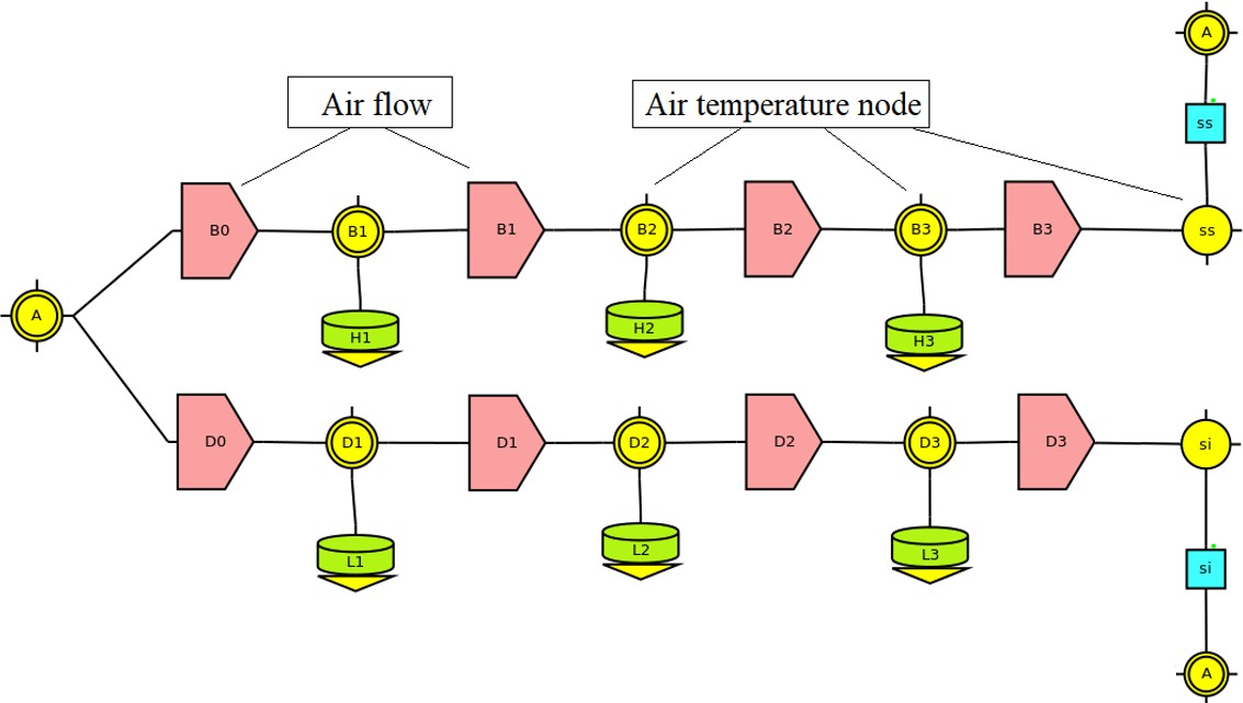 Both air-mass flows m˙a and m˙b are determined by instantaneous thermal balance at air temperature nodes B1 and D1, respectively [40].