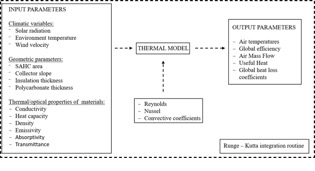 1.9 m length), which was simulated by using the validated model presented here and taking in consideration both the same climatic conditions and constructive materials as the trapezoidal one. It is observed that the output temperature remains about 100 ºC despite its poor global efficiency. Low useful heat is also observed for this rectangular configuration, and this could be explained due to the low air mas flow under natural convective conditions, suggesting the implementation of air forced systems to the designed SAHC in order to improve the thermal gain and the efficiency as well.
