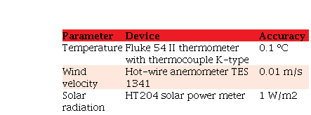 The solar radiation was measured with a solarimeter placed on the covering surface of the SAHC, as shown in Fig. 11.b. The air temperatures were measured according to the nodes in the simulation model: B1, B2, B3, and ss. It was only possible to place the temperature sensors in the upper channel of the collector. A thermometer Fluke 54 II with type-K thermocouples was used for measuring the temperature. The surrounding wind velocity was measured using a hot-wire anemometer. Table 2 briefly describes the used instruments.