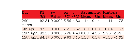 The results of the statistical analysis show a p-value lower than 0.05 for all cases, which indicates a statistically significant relation between the simulated and measured values, with a confidence level of 95%. As mentioned above, the model explains the correlation between the analyzed variables by an R2 higher than 80%, which indicates a good relation between variables. In general, asymmetry and kurtosis coefficients present values within a 2 – -2 range. This implies that the data sets have a normal distribution. However, it was observed outside the range values only for April 12. This significant deviation was caused by the high meteorological variation: solar radiation decrement combined with high external wind velocity.