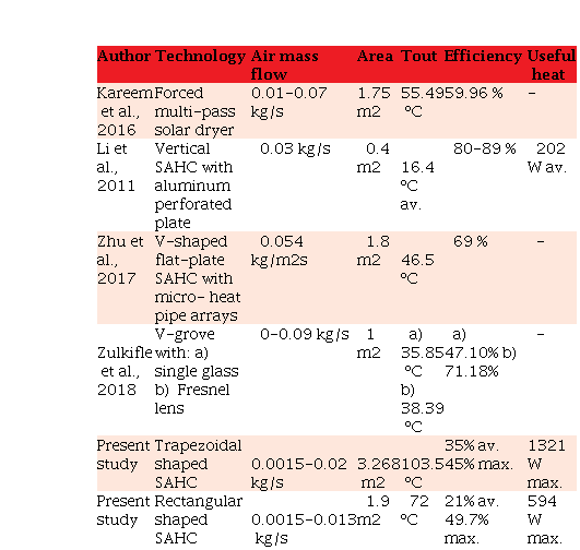 literature. While most of the designs were focused on thermal efficiency, with values above 60% (similar to vacuum pipes based-on collector) mostly reached, low thermal power outputs were reported. Additionally, the reported outlet air temperature was no higher than 71 ºC. This could be related to different parameters such as solar resource and sky conditions, orientation and disposition of collectors, sizes of solar absorber, materials used for prototype constructions, etc. The solar collector studied here reached higher temperatures and power thermal output, despite the fact that lower thermal efficiency was performed, compared with other works. This increase of air temperature and power thermal output was due to the extra area conforming the trapezoidal shape of the collector. Additionally, a numerical scenario as the SAHC built with rectangular shape was presented here. In this case, temperatures, efficiencies, and power outputs were similar to other authors. Furthermore, the comparison between both proposed models (trapezoidal and rectangular) revealed that better air heating conditions are easily achieved by simple modification in geometrical shape and collecting area expansion.