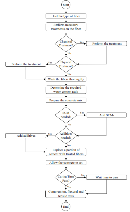A flowchart showing the recommended steps to follow in order to prepare every type of fiber mix is shown in Figure 4. This flowchart can help researchers who are identifying available natural fibers in their location and help with the decision-making on the exploration of the natural fibers in concrete mixes. In addition, the flowchart provides the various steps that are relevant in the process of developing a mix design in which natural fibers are used to both improve the mechanical properties and replace the fine materials (cement) for a more sustainable alternative.