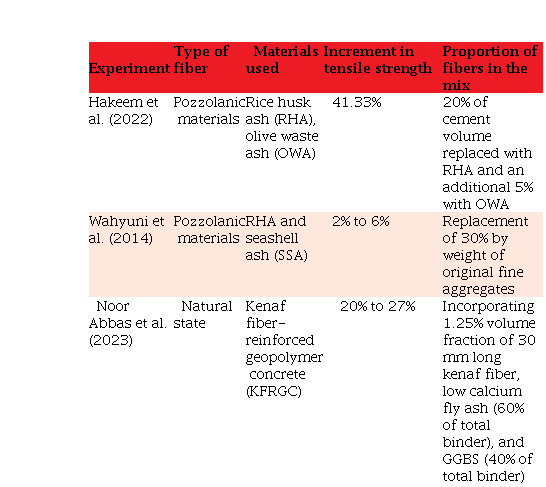 properties based on literature. Concrete mixes that have been studied in the literature and that have resulted in improved properties as compared to the reference mix include biomaterials such as rice husk ash, olive waste ash, seashell ash, bamboo fiber, kenaf fiber-reinforced geopolymer concrete, and jute fiber. In these cases, fibers are both used for mechanical properties and ground to a fine material to replace part of the cement.