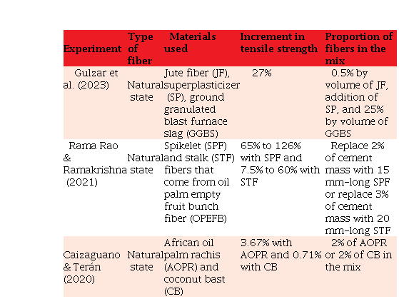 fiber is available locally before importing it. This aligns with the study’s aim to be as environmentally friendly as possible. Then, for every paper, the fibers are treated either in a chemical or physical manner to prepare them before including them in the mix. For instance, some fibers are placed in a lime hydroxide solution [10], which would indicate a chemical treatment. On the contrary, other fibers are cut to a determined length [8], which implies a physical treatment. Some papers include both a chemical and a physical treatment, and the chemical treatment usually comes first. Then, the general mix design is carried out by considering the water-cement ratio and whether supplementary cementitious materials (SCM) are needed according to each paper. After that comes a crucial step, which is the replacement of a percentage of cement, either by volume or by weight, with the natural fiber to be used. The replacement must be done in the percentage that each paper indicates because each fiber behaves differently and needs more or less quantity to achieve the expected results. Lastly, the appropriate tests must be conducted to evaluate the mechanical performance of the mix which should yield results nearly similar to those of the papers studied.
