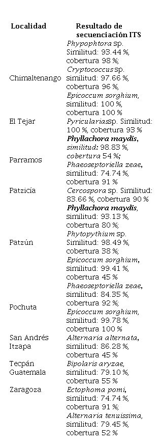 TABLA 2. Comunidad fúngica presente en los estromas de las muestras enviadas a secuenciación, recolectadas durante el diagnóstico del CMA en Chimaltenango, Guatemala, 2022.