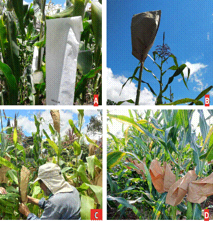 FIGURA 1. Polinización controlada de las accesiones de maíz a incrementar. A aislamiento de la inflorescencia femenina con bolsas tipo glassine, B recolección del polen con bolsas tipo kraft, C fecundación de los estigmas con el polen seleccionado, D inflorescencias femeninas polinizadas y aisladas.