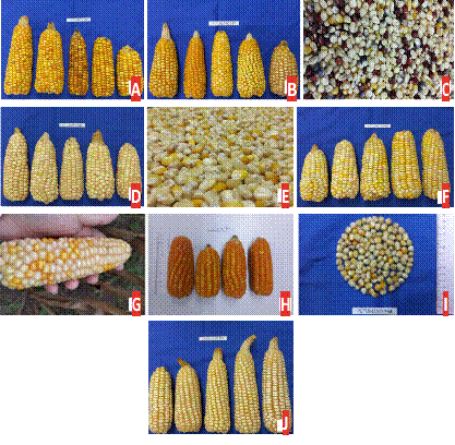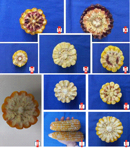 FIGURA 2. Maíces rematriados al pueblo Kamëntsá-biyá. A Putumayo 307, B Putumayo 317, C Putumayo 343, D Putumayo 344, E Putumayo 345, F Putumayo 346, G Putumayo 359, H Putumayo 362, I Putumayo 364, y J Putumayo 374.