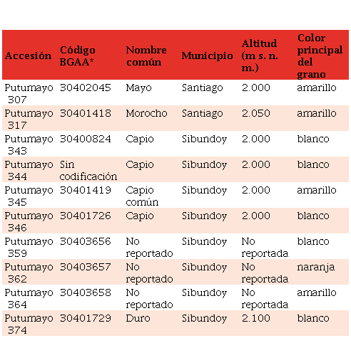 Diez accesiones de maíz (Tabla 1) recolectadas en el Valle de Sibundoy, Putumayo, y conservadas en el BGAA, fueron tomadas para su incremento en campo y posterior Rematriación al pueblo Kamëntsá-biyá. Estas accesiones fueron transferidas mediante la firma de un Acuerdo de Entrega de Recurso Biológico emitido por AGROSAVIA, como garante y administrador de los recursos genéticos de Colombia.