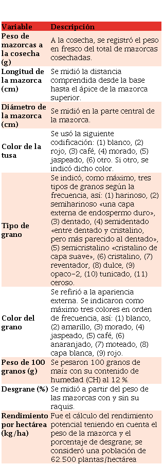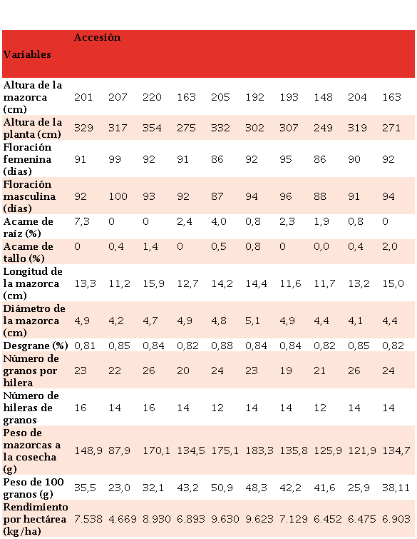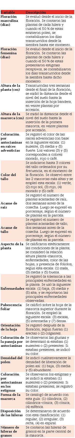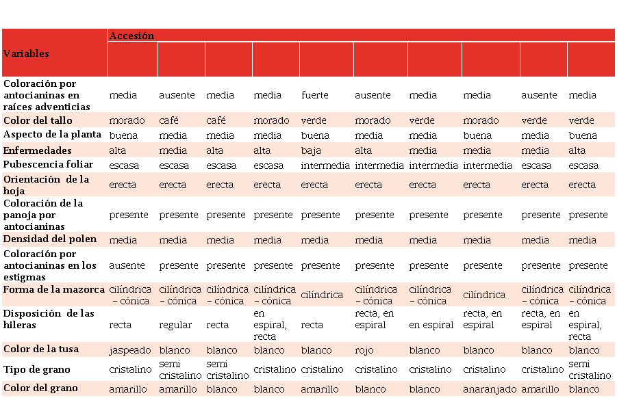 Durante el desarrollo del cultivo se emplearon 28 variables del descriptor del IBPGR [53], para caracterizar morfológica y agronómicamente las accesiones, en al menos 20 plantas y/o mazorcas (Tabla 2).