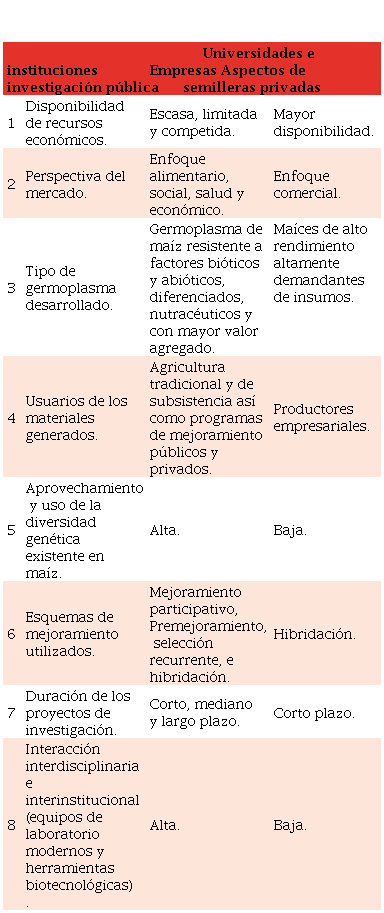 En Latinoamérica, los programas de mejoramiento genético de maíz dependientes de universidades e instituciones de investigación financiadas con recursos públicos, contrastan con los programas de mejoramiento de las empresas semilleras multinacionales, nacionales y regionales en una serie de aspectos, entre los que se encuentran: la disponibilidad de recursos económicos, la perspectiva del mercado, el desarrollo de materiales mejorados, los usuarios de los materiales generados, el aprovechamiento y uso de la diversidad genética existente, los esquemas de mejoramiento utilizados, el término a corto, mediano y largo plazo de los proyectos de investigación, el trabajo interdisciplinario e interinstitucional, entre otros.