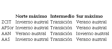 Esta tabla relaciona la ubicación e intensidad de cada característica climatológica en función de la estación del año. El color rojo identifica al invierno austral, el azul al verano austral, el gris identifica el período de transición entre el invierno y el verano. Las letras en mayúsculas son acrónimos de cada característica climatológica.