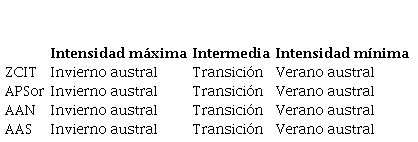Se evidencia la existencia de un patrón estacional en el comportamiento de las características climatológicas (Ver tabla 3). De manera sincrónica, en el invierno austral, todas las características presentan intensidad máxima, en el verano austral presentan intensidad mínima y en el período de transición entre el verano/invierno austral presentan intensidad media.