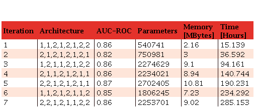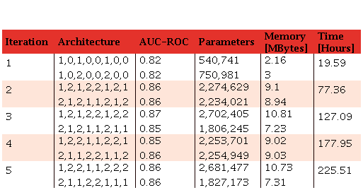 The training dataset used is 187,641 images for training and 7,505 images for testing. Each architecture is trained for 50 epochs using a standard SGD optimizer with a learning rate of 0.0004, a decay factor of 0.97, a batch size of 24, and a momentum of 0.9. These models were trained in their sequential version on a PC with processor i9-9900K, memory RAM of 64 Gigabytes, and GPU RTX 3090 24 GB, with 50 epochs because this was sufficient enough in terms of precision. Additional epochs did not improve the final precision and instead increased the computational cost. In the sequential execution of GenNAS with 10 iterations, the optimal neural network architecture was determined in the fifth iteration. This process took a total machine time of 190.2 hours, resulting in an AUC-ROC of 0.869, with the identified neural network structure being [2,2,1,2,1,2,1,1], shown in Table 2.